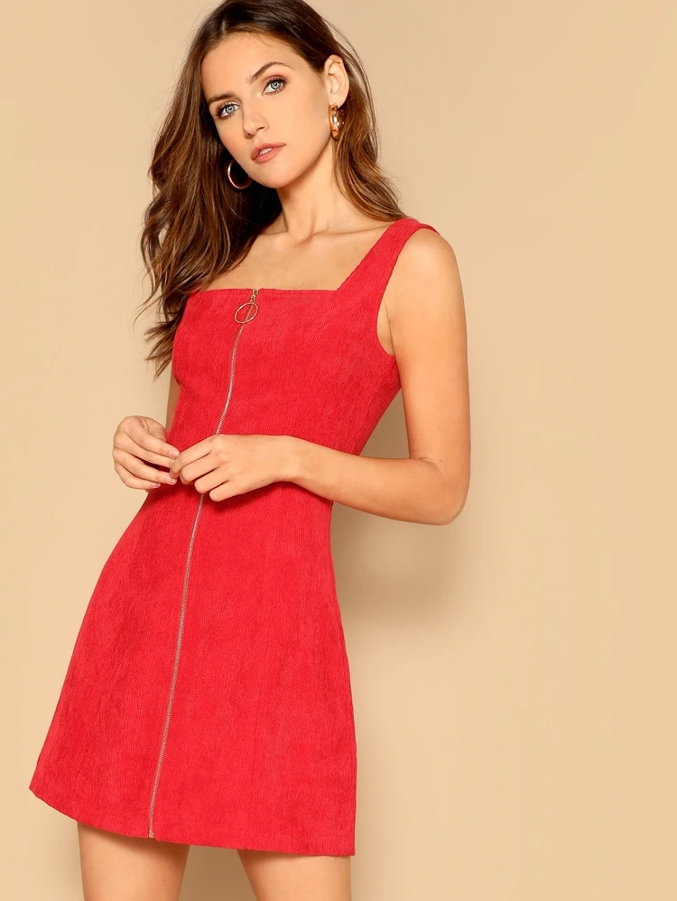 O Ring Zip Up Corduroy Trapeze Dress Shein Usa