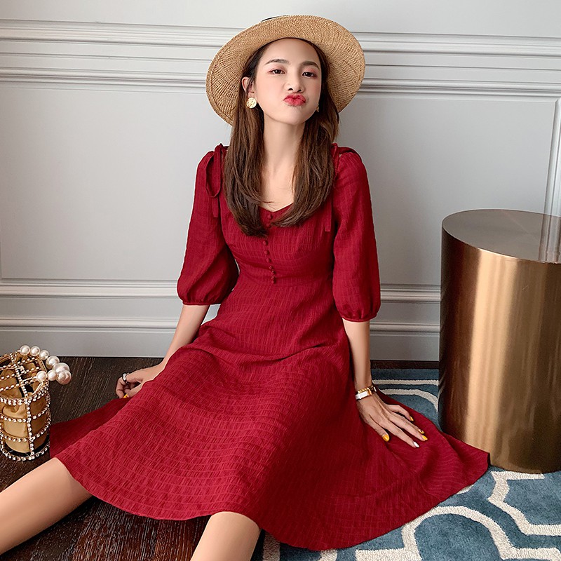 Korean Vintage Red Casual Dresses Women Summer Elegant Half Sleeve