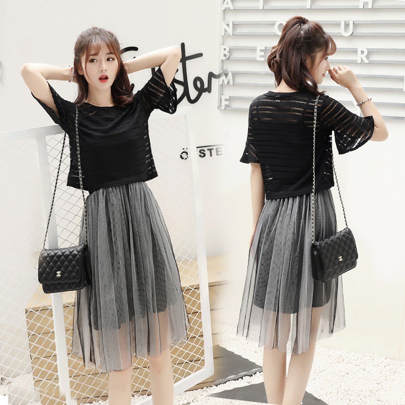 2pcs Set Wear Suits Outfits Korean Ladies Slim Slip Lace Midi